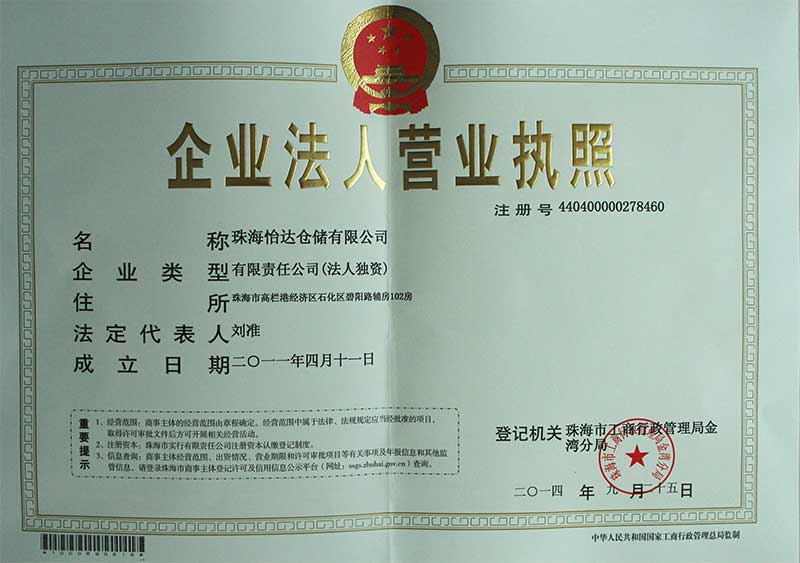 珠海怡達(dá)倉(cāng)儲(chǔ)法人執(zhí)照